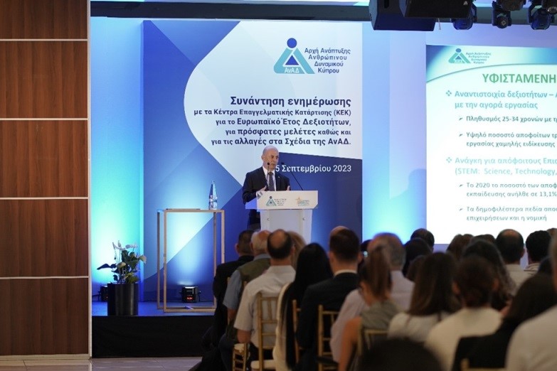 Την Παρασκευή, 15 Σεπτεμβρίου 2023, πραγματοποιήθηκε η ετήσια συνάντηση της Αρχής Ανάπτυξης Ανθρώπινου Δυναμικού Κύπρου (ΑνΑΔ) με τα Κέντρα Επαγγελματικής Κατάρτισης (ΚΕΚ), η οποία φέτος υλοποιήθηκε στο πλαίσιο του «Ευρωπαϊκού Έτους Δεξιοτήτων».