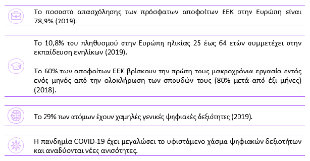 Η πανδημία του κορωνοϊού έχει διαταράξει σημαντικά όλες τις μορφές εκπαίδευσης και κατάρτισης. Αυτή είναι μια ευκαιρία για μια νέα προσέγγιση στην ΕΕΚ, καθιστώντας την πιο μοντέρνα, ελκυστική, ευέλικτη και κατάλληλη για την ψηφιακή εποχή και την πράσινη μετάβαση. Την 1η Ιουλίου 2020, η Επιτροπή υπέβαλε μια φιλόδοξη ατζέντα για να καθοδηγήσει τις προσπάθειες ανάκαμψης στην απασχόληση και την κοινωνική πολιτική από τον COVID-19, με έμφαση στις δεξιότητες και την ΕΕΚ. Η ανακοίνωσή της σχετικά με ένα Ευρωπαϊκό Θεματολόγιο Δεξιοτήτων για βιώσιμη ανταγωνιστικότητα, κοινωνική δικαιοσύνη και ανθεκτικότητα προτείνει 12 δράσεις της Ευρωπαϊκής Ένωσης για την υποστήριξη συνεργασιών για απόκτηση και αναβάθμιση δεξιοτήτων, επανειδίκευση και ενίσχυση της διά βίου μάθησης. Η Σύσταση της Επιτροπής για την ΕΕΚ επιδιώκει να διασφαλίσει ότι η ΕΕΚ εφοδιάζει το ανθρώπινο δυναμικό με τις δεξιότητες για να υποστηρίξει την ανάκαμψη από τον COVID-19, καθώς και τις πράσινες και ψηφιακές μεταβάσεις, με κοινωνικά δίκαιο τρόπο. Περισσότερες πληροφορίες υπάρχουν στην ηλεκτρονική διεύθυνση https://ec.europa.eu/education/policies/eu-policy-in-the-field-of-vocational-education-and-training-vet_en.
