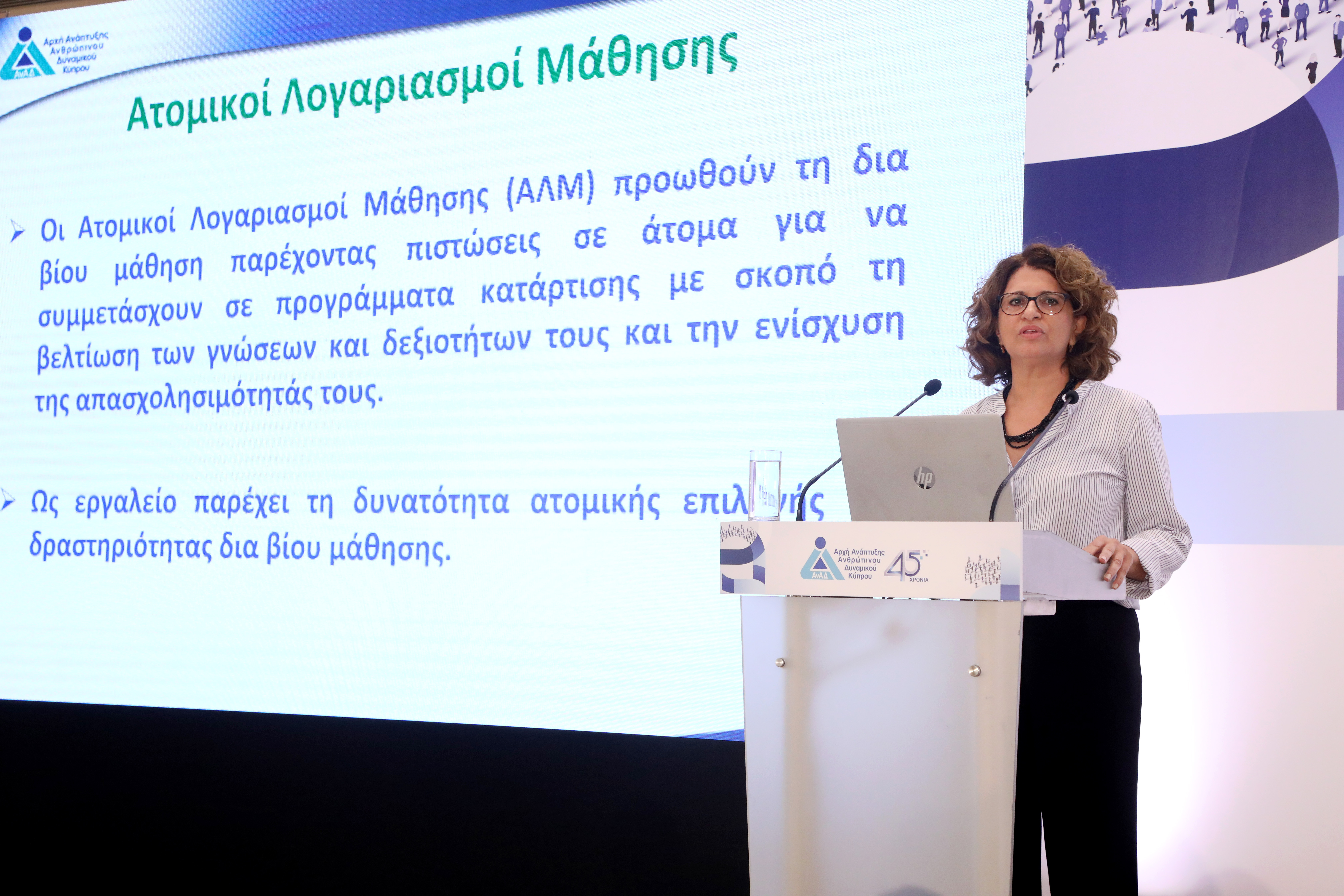 Ακολούθησε η παρουσίαση από την κυρία Πάολα Παπαφιλίππου Πιττάλη, Λειτουργό Α΄ (Διεύθυνση Υπηρεσιών Κατάρτισης) του νέου έργου της ΑνΑΔ «Ατομικοί Λογαριασμοί Μάθησης» κατά την οποία, ανέλυσε πως αυτοί προωθούν τη διά βίου μάθηση παρέχοντας πιστώσεις σε άτομα για να συμμετάσχουν σε προγράμματα κατάρτισης ώστε να βελτιώσουν τις γνώσεις και δεξιότητες τους.